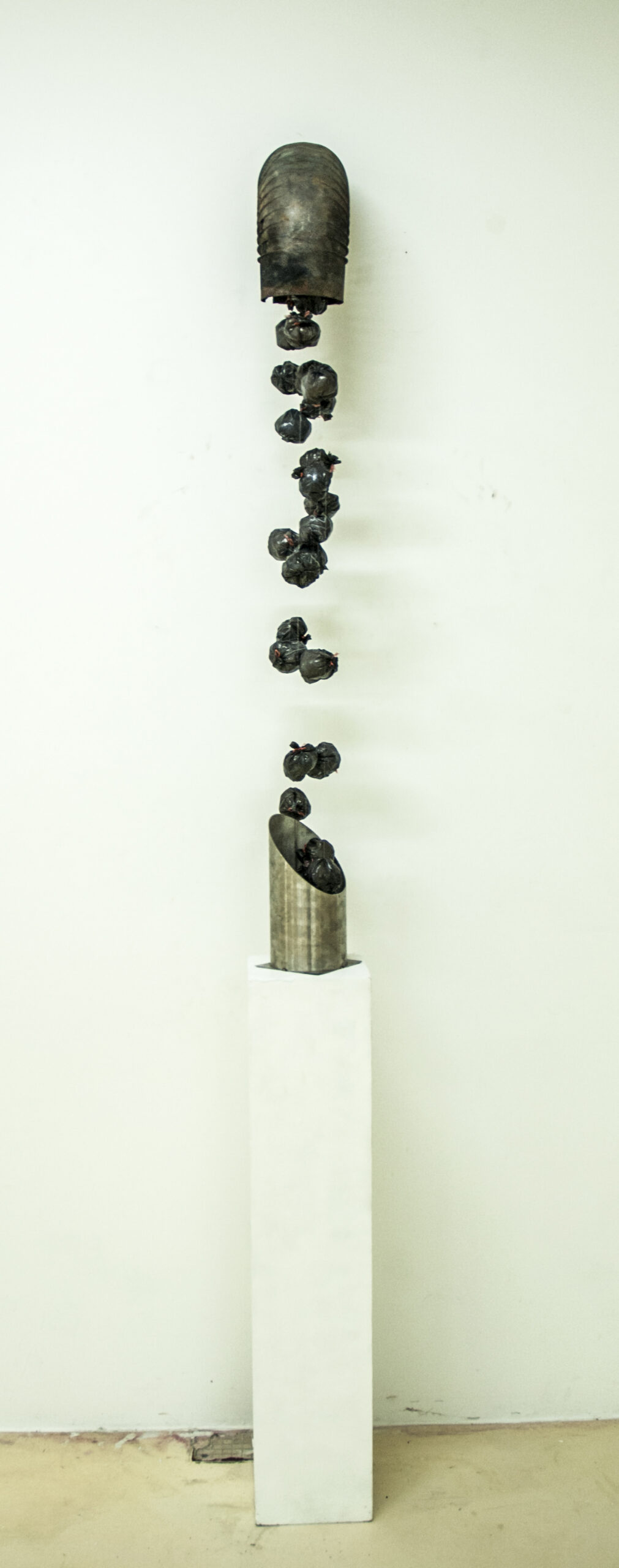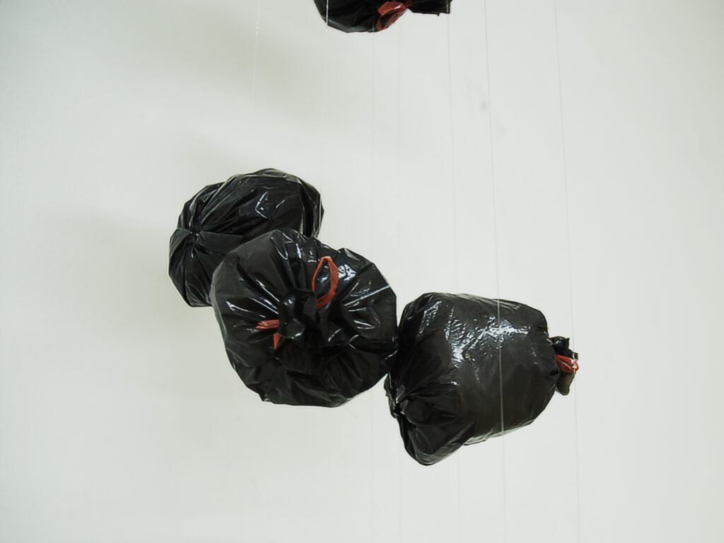 Fontaine de Jouvence est une sculpture reflétant notre rapport à la surconsommation et à la production de déchets. Dans une mise en espace induite par des conduits récupérés en déchèterie, une multitude de mini poubelles sont suspendues dans le temps comme figées dans leur chute infinie. Chaque sac poubelle est rempli de mégots de cigarettes, gardant olfactivement une cohérence à l’objet.
