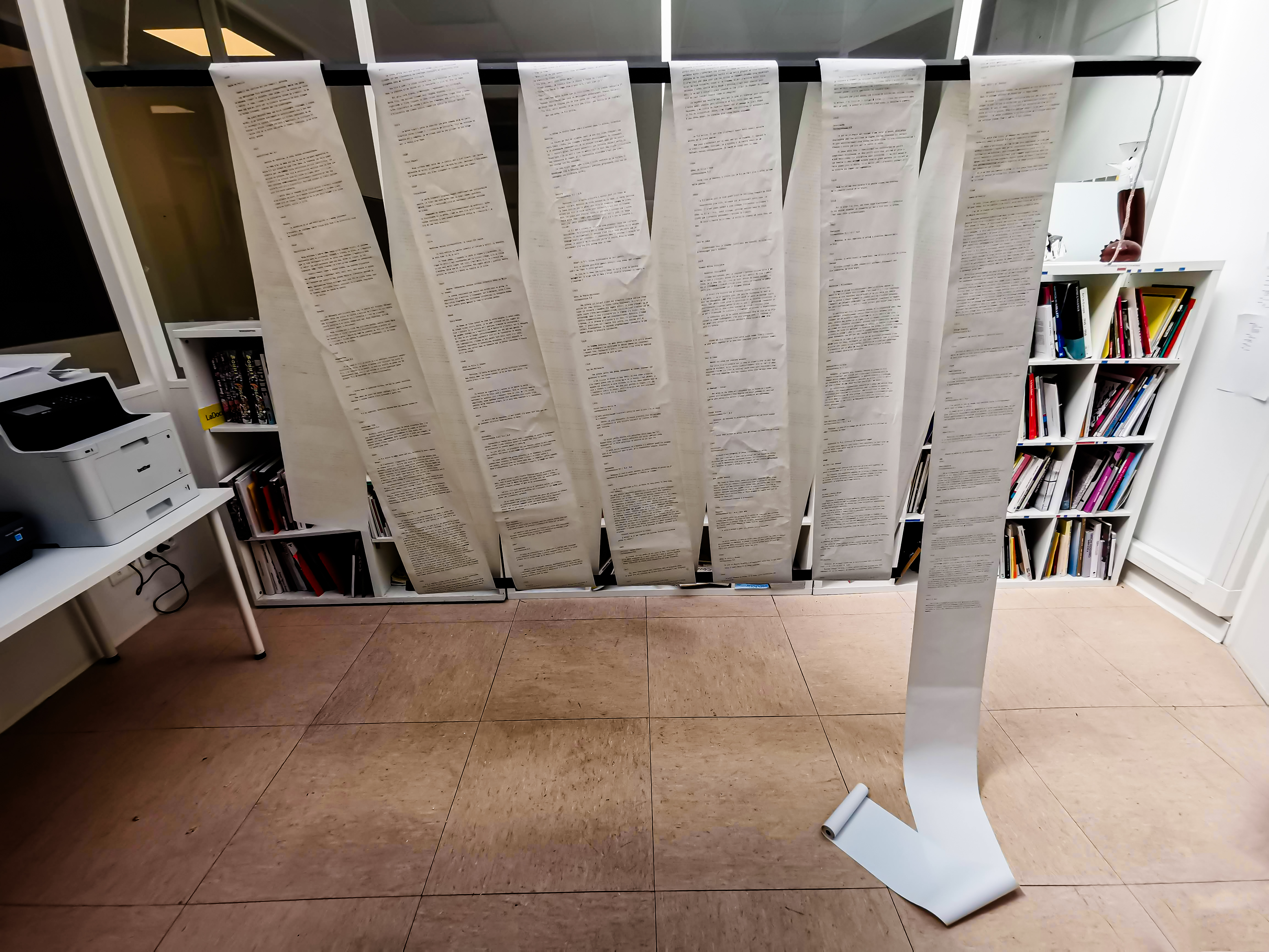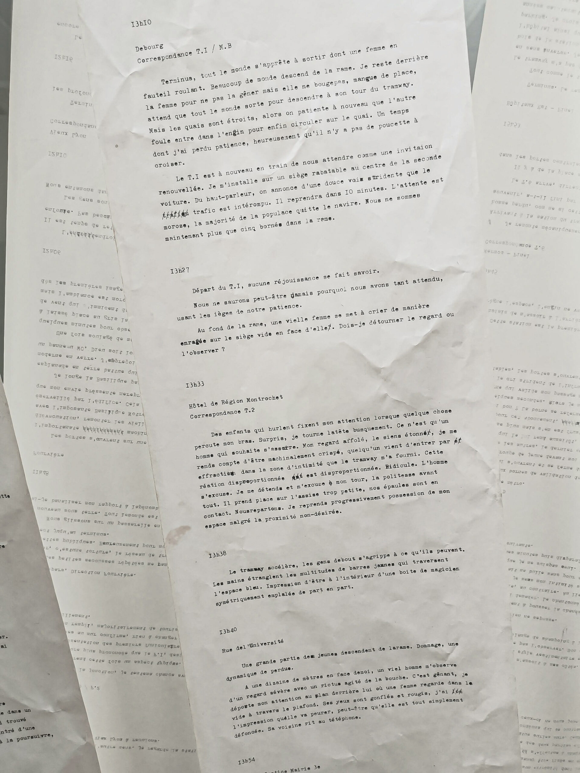 La seconde partie du projet fut la retranscription de ce cahier de bord. Dans une intention de prolongation d’épuisement du sujet, c’est le geste qui prend la relève par l’utilisation fastidieuse d’une machine à écrire bruyante, mécanique et répétitive en réponse aux transports. Le rouleau de papier fax amène une linéarité d’écriture et de lecture faisant référence aux lignes de transport mais aussi à l’expérience psychique éprouvée.