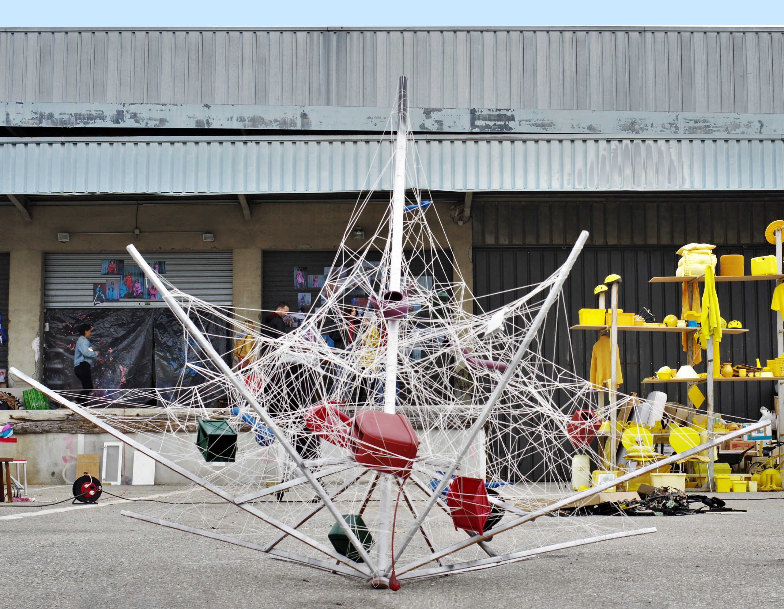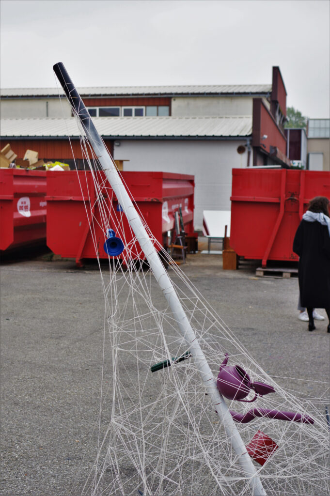 Philophobia est une sculpture in-situ réalisé à partir d’objets récupérés dans une benne à déchet de l’association Scouts de Cluse et exposé sur le lieu.