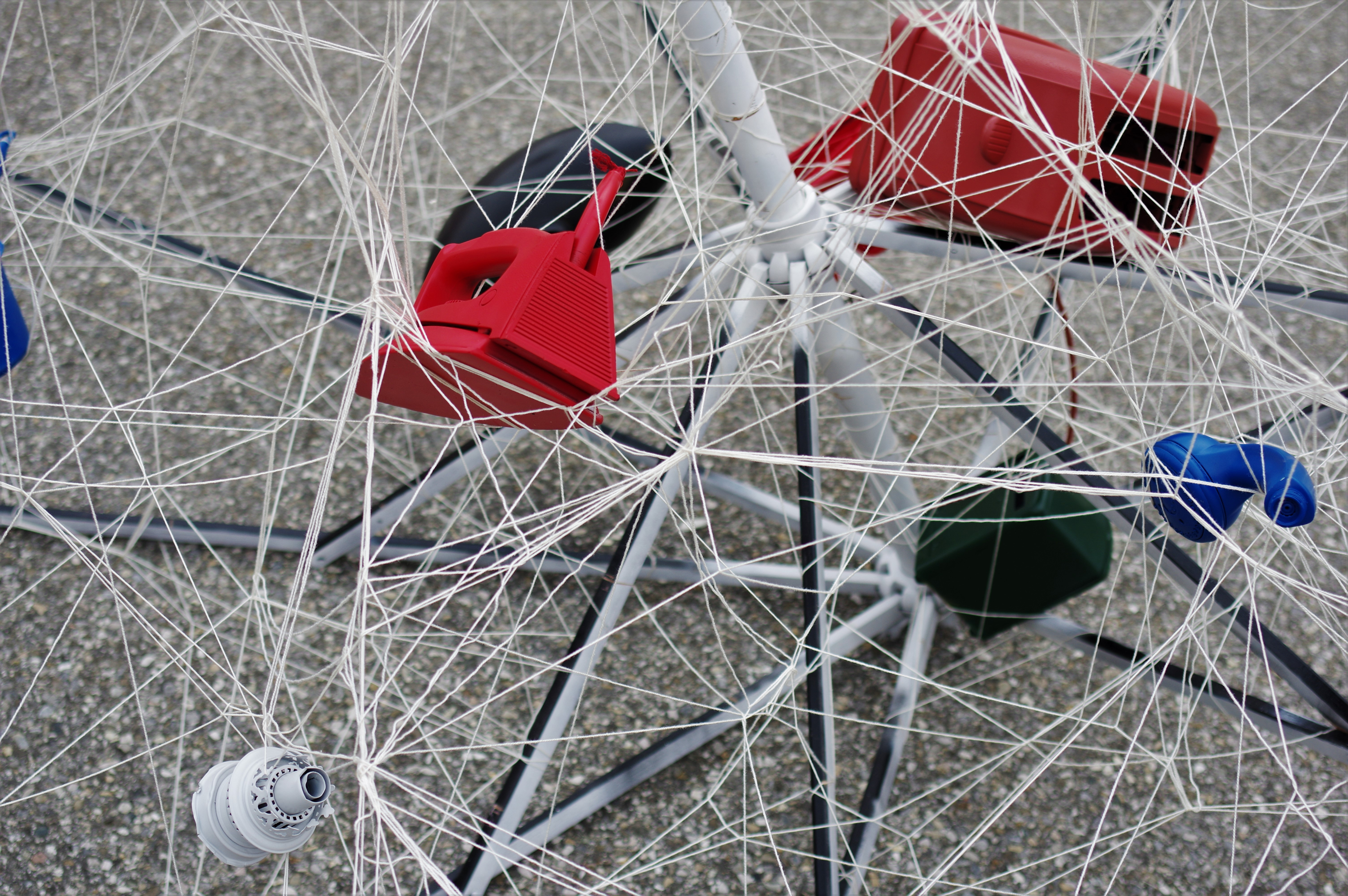 Objets divers, fil, peinture acrylique en bombe.